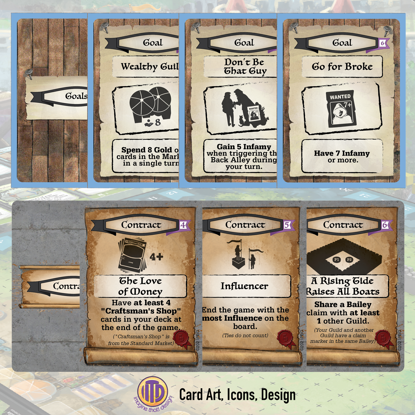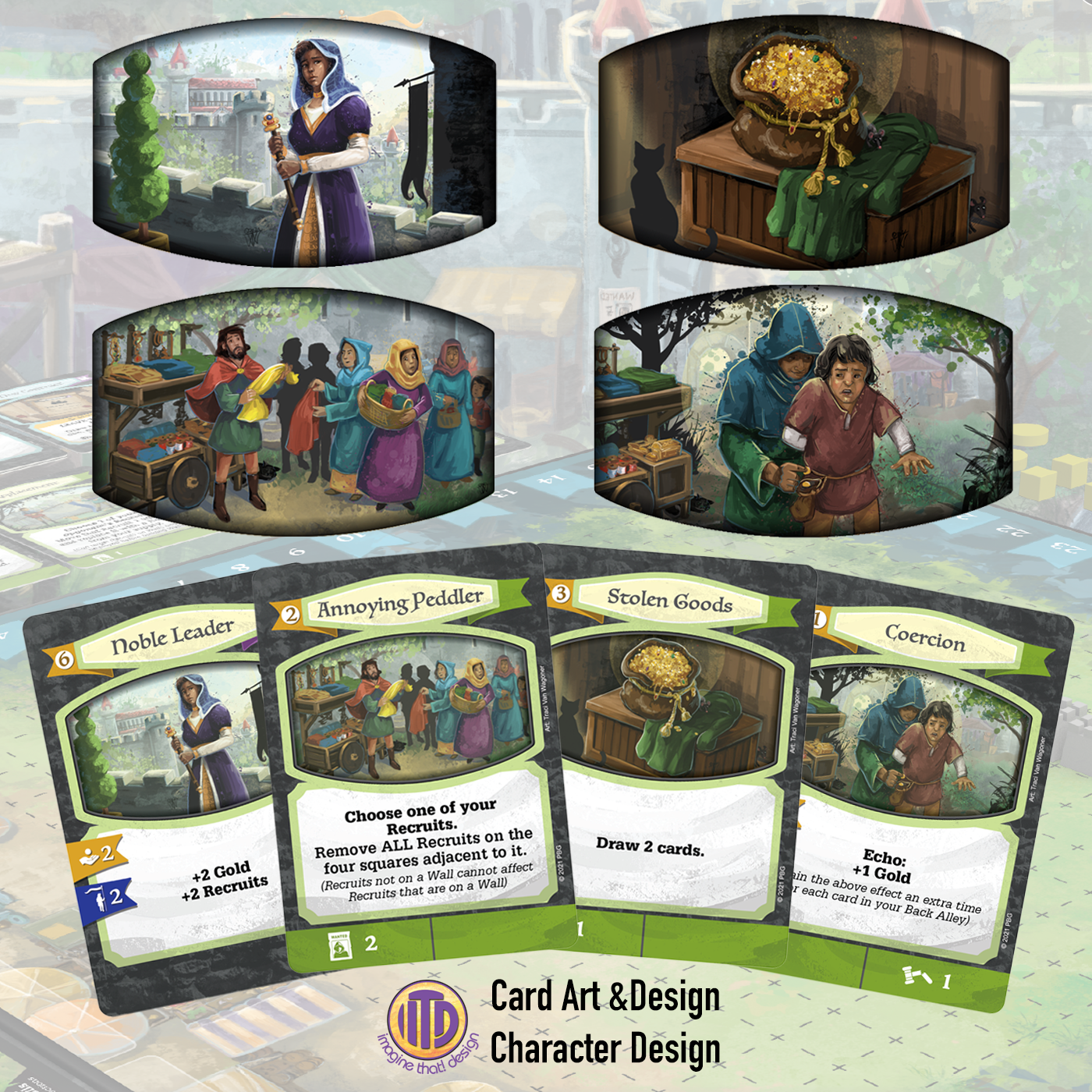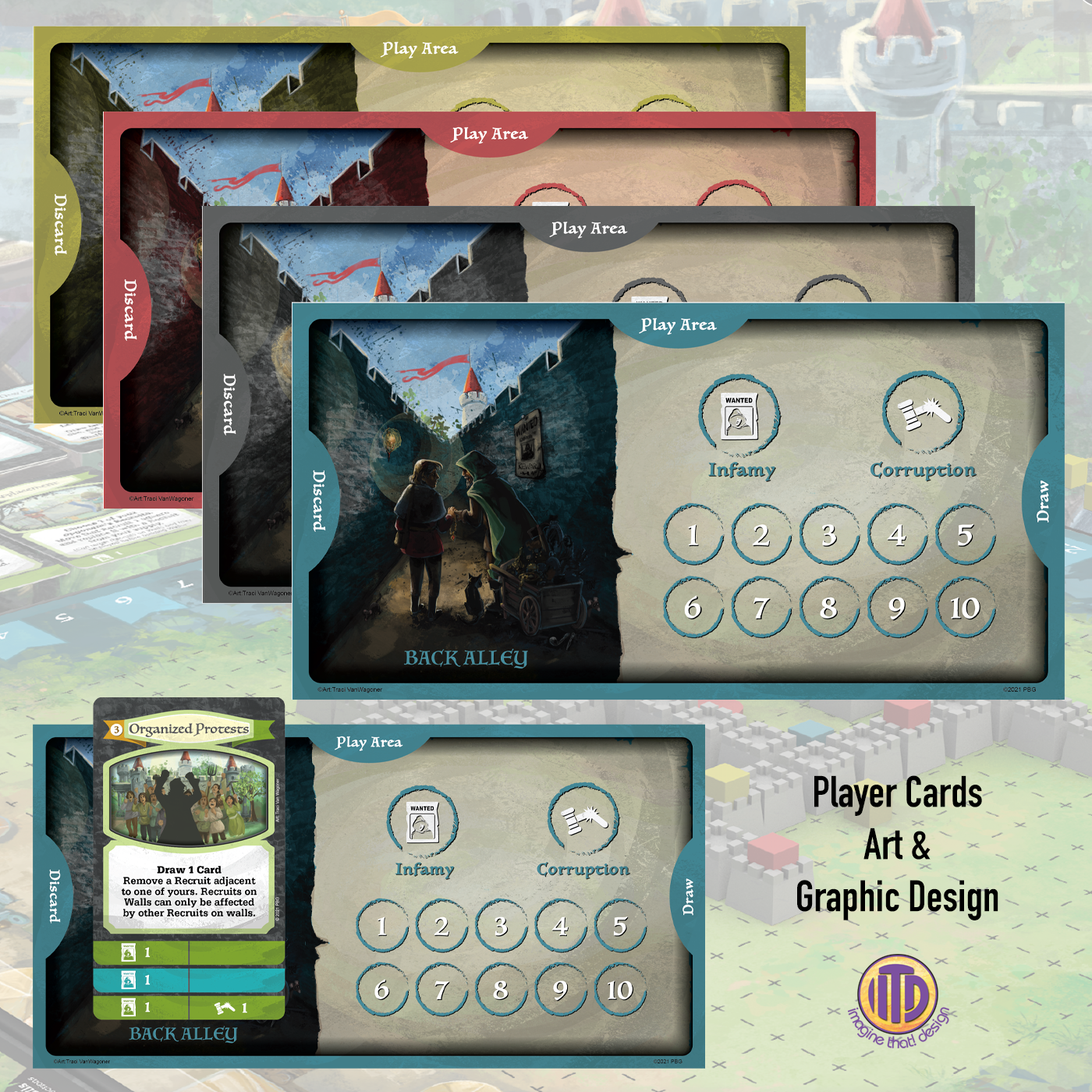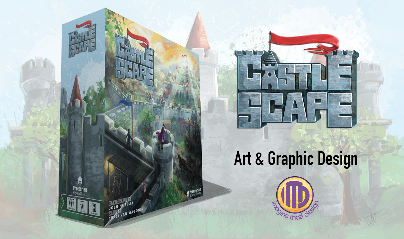 Castle Scape by Praetorian Games is a card drafting game combined with castle building. We did all the character design, illustrations, art, icons, and graphic design for this tabletop game, creating a fantasy world to help players immerse themselves in the game as guild members trying to control the most territory with their castle walls and baileys.