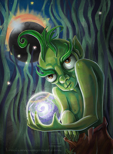 A goblin mage holds a crystal ball and stands near a fire as the moon covers the sun in a solar eclipse over the swamp.